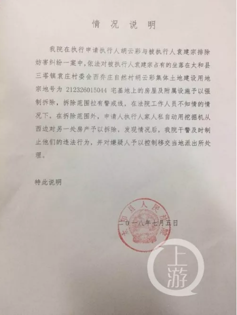 盖有太和法院公章的情况说明显示,拆除范围拉的有警戒线,在拆除范围外,胡家私自动用挖掘机,对另一处房屋予以拆除,发现情况后,太和法院干警及时制止他们的违法行为,并对嫌疑人予以控制移交当地派出所处理。