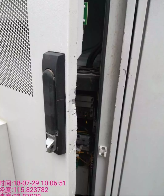 2018年7月29日9:20左右,中国铁塔阜阳分公司接到市民反映:市医院新区附近有一处通信机柜门未关闭。相关部门立即安排维护人员赶赴现场查看。10:00左右,维护人员到达现场,对基站整体情况进行仔细查勘。发现机柜门电子锁被恶意撬坏,导致柜门无法关闭,上午10:30左右,维护人员将柜门修复并关闭。
